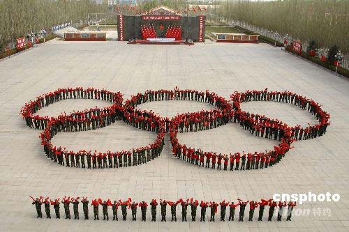 2008年5月8日,奧運火炬成功完成珠峰傳遞的消息傳來,即將執(zhí)行青藏線運輸任務(wù)的解放軍總后勤部青藏兵站部某汽車團官兵組成“五環(huán)”標(biāo)志,慶祝奧運夢想首次登上世界第三極。中新社發(fā) 吳蘇琳 攝