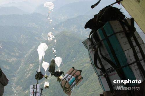 5月16日11時59分,中國空軍航空兵某師在向四川地震災(zāi)區(qū)空投救災(zāi)物資。連日來,空軍發(fā)揮空中運(yùn)輸優(yōu)勢,連續(xù)出動大型運(yùn)輸機(jī),不間斷大規(guī)模的向四川災(zāi)區(qū)投送災(zāi)民急需的藥品、食物、帳篷等生活用品。中新社發(fā) 譚超 攝