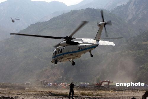 5月19日,中國空軍繼續高密度對四川省汶川大地震核心重災區映秀鎮空運救災物資與部隊急需的飲用水等給養。雖然都江堰至映秀的“生命線公路”已經打通,但是不斷的余震與降雨每天都會多次中斷車輛通行。中新社發 任晨鳴 攝