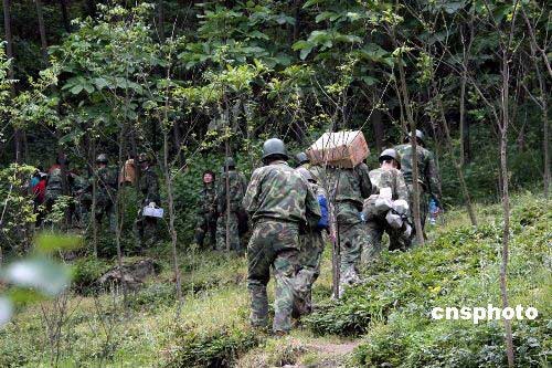 5月18日,中共中央總書記胡錦濤在北川視察災情時,聽說鎣華鎮北門村麻柳坪道路至今沒有打通,災民生活十分困難,當即要求空軍派兵支援。中國空軍125名空降兵精干小分隊帶著食物、藥品徙步32公里,冒著不斷發生的余震、通過37處滑波,第一個進入海拔1200多米的麻柳坪。圖為空降兵首批小分隊扛著藥品食物、冒著高溫向麻柳坪開進的情景。中新社發 譚超 攝