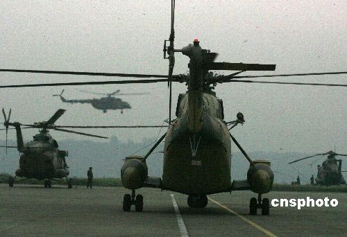 五月二十日,中央軍委調集四川省的四十一架軍方直升飛機轉場,飛抵離災區最近的綿陽國際機場,爭分奪秒赴災區救援。中新社發 賈國榮 攝
