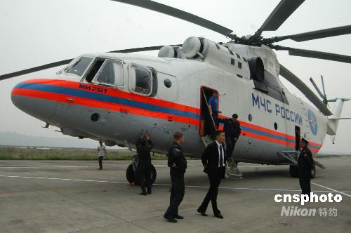 5月25日下午17時(shí)45分,一架俄羅斯米-26重型運(yùn)輸直升機(jī)降落四川綿陽(yáng)南郊機(jī)場(chǎng)。據(jù)俄羅斯機(jī)長(zhǎng)安東介紹,米-26重型運(yùn)輸直升機(jī)可24小時(shí)晝夜飛行,可在能見(jiàn)度600米、高度60米的空域執(zhí)行任務(wù)。10名機(jī)組人員經(jīng)常參與國(guó)際救援任務(wù),對(duì)山區(qū)復(fù)雜地形執(zhí)行救援任務(wù)有著豐富經(jīng)驗(yàn)。米-26是目前世界上最大的直升機(jī),被稱(chēng)為“空中巨無(wú)霸”,一次運(yùn)載能力達(dá)20噸。中新社發(fā) 成和平 攝