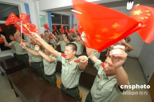 2008年9月25日晚,浙江臺州邊防支隊組織官兵收看“神七”發射實況直播。當官兵們看到火箭成功點火升空時,頓時揮舞起手中的五星紅旗熱烈地歡呼起來。中新社發 郟策 攝