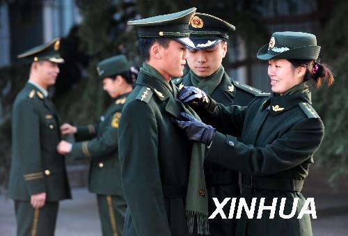 11月10日,青島公安邊防支隊官兵正在試穿07式冬季軍服。當日,武警山東總隊、山東公安邊防總隊開始換發武警07式冬季軍服。新款冬裝分為冬常服、常服大衣和制式毛衣,均為深橄欖綠色,冬常服由關領改為開領,毛上衣可佩戴肩章作外衣穿著,軍官常服大衣可佩戴圍巾。新華社記者 李紫恒攝