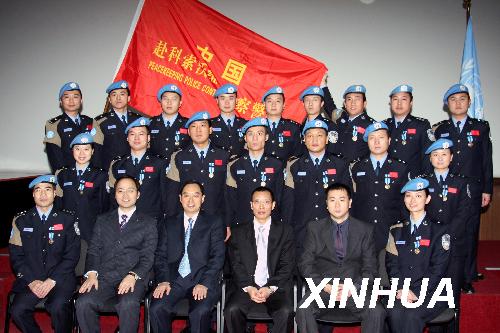 11月16日,中國第五批駐科索沃維和警察榮獲聯合國維和勛章的授勛儀式在科首府普里什蒂納舉行。第五批中國維和警察于2008年3月11日抵達普里什蒂納,執行聯合國為期一年的維和任務。這支警隊是四川省公安廳受中國公安部委托單獨組建的。新華社記者連國輝攝