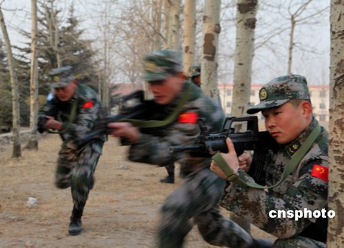1月7日,濟南軍區第二批赴蘇丹達爾富爾維和工程兵大隊警衛中隊的官兵進行出國前最后階段的防衛訓練。中新社發 畢華明 攝