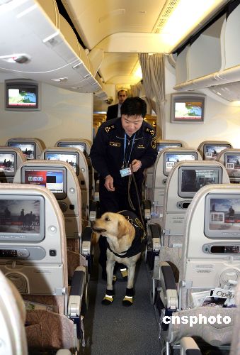 春節(jié)前夕,兩條名叫“維特”和“泰格”的拉布拉多緝毒犬出現(xiàn)在T3航站樓一架來自阿聯(lián)酋的飛機機艙內(nèi)。這是中國緝毒犬在歷史上首次登機檢查。近年來北京空港口岸人體藏毒和行李夾層藏毒案件明顯增多。為了進一步增加緝毒手段的主動性,提高口岸查毒的準確率,北京海關緝私局決定訓練緝毒犬進行登機檢查。海關緝毒人員對付跨國販毒分子又多了一個殺手锏。中新社發(fā) 雷虹 攝