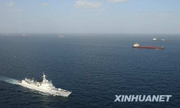 2月18日,中國海軍編隊成功護送13艘商船安全駛出亞丁灣,這是海軍編隊完成的第21批次護航任務,也是執行護航任務以來的最大規模的護航行動。船隊綿延10公里,場面蔚為壯觀。新華社記者 朱鴻亮 攝