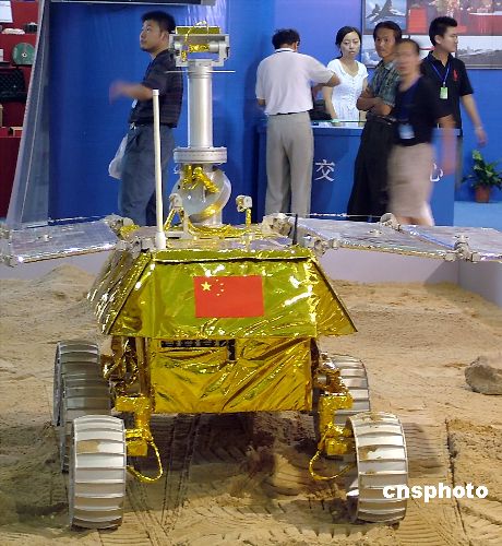 7月9日,腳踩6個輪子,站在“月球”表面,頭頂CCD相機四周轉動,巡視到的場景在電腦上即時傳送……在上海航空展中,“月球巡視探測器”表現不凡。據了解,經過層層審批才得以在公眾前亮相的月球車,將于2012年“嫦娥工程”實現“落地”計劃后登陸月球。中新社發 紹常 攝