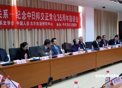 10月18日,“廖承志與中日關系——紀念中日邦交正常化35周年座談會”在北京中國人民大學舉行。該座談會由中國中日關系學會、中國人民大學東亞研究中心共同舉辦,與會的有中日友好協會副會長王效賢、日本駐華大使館公使道上尚史、以及幾十位專家學者、相關人士。大家在緬懷廖承志先生的同時,對中日關系的發展紛紛發表了自己的見解,氣氛凝重而又不失建設性。據悉,這次座談會的舉行源自新近由中共黨史出版社出版的一本新書,書名為《廖承志與日本》。作者是原新華社駐東京首席記者吳學文先生和時事出版社編審王俊彥先生。中新社發 單琪 攝