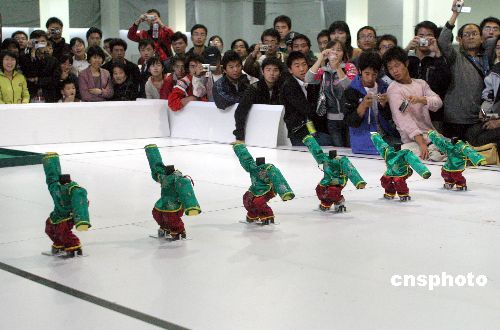 10月26日,為期3天的2007“銀泉杯”中國機(jī)器人大賽暨Robo Cup中國公開賽在濟(jì)南大學(xué)科技園開幕。據(jù)了解,本次大賽共有來自國內(nèi)外的400多支隊伍1000余名選手參賽,大賽設(shè)置了34個比賽項目,包括Robo Cup機(jī)器人比賽、FIRA機(jī)器人比賽、空中機(jī)器人比賽、水中機(jī)器人比賽、舞蹈機(jī)器人比賽及雙足競步機(jī)器人比賽等多種比賽類型,是歷屆中國機(jī)器人大賽中比賽種類最多和最全的一次。中新社發(fā) 龔輝 攝