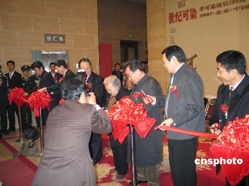 圖為紀念李可染100周年展覽開幕式現場,李可染夫人、著名雕塑家鄒佩珠女士(中)等剪彩。