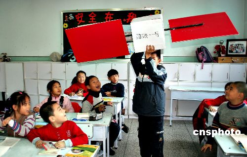 11月27日,哈爾濱市江沿小學(xué)藝術(shù)班的同學(xué)在展示他們制做“嫦娥一號(hào)”的模型。中新社發(fā) 姚庭山 攝