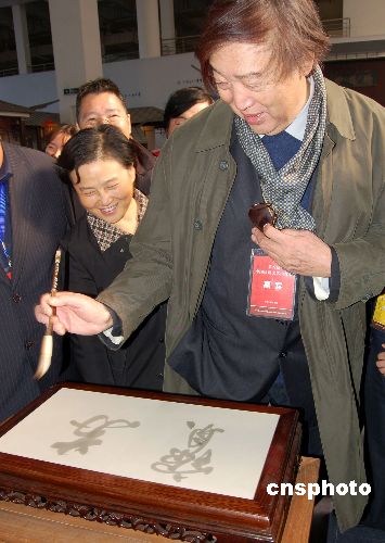 第八屆中國民間文藝山花獎頒獎典禮于11月29日在蘇州市陽澄湖畔相城區(qū)舉行,相城區(qū)也成為山花獎永久評獎基地。具有深厚歷史文化底蘊、以民間文藝“相城十絕”著稱的相城區(qū),還將被中國民間文藝家協(xié)會授予“中國民間藝術之鄉(xiāng)”榮譽稱號。圖為中國文聯副主席、中國民間文藝家協(xié)會主席馮驥才,用“相城十絕”之一的蘇州御窯金磚現場寫字。中新社發(fā) 邱勇 攝