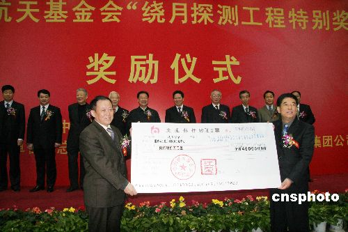 十二月三日,中國航天基金會秘書長霍廣耀(左)向國防科工委月球探測工程中心主任胡浩頒發“繞月探測工程特別獎”,獎金總額八百四十萬元人民幣,獎勵參加繞月探測工程研制、生產、發射、測控和應用等任務中有突出貢獻的單位與個人。中新社發 孫自法 攝