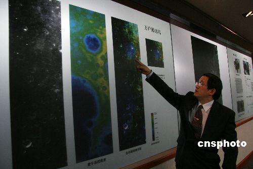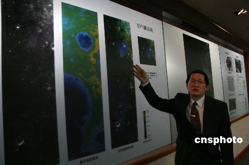 十二月十一日,中國繞月探測工程地面應用系統總設計師李春來,向媒體介紹“嫦娥一號”衛星CCD相機對月球背面進行成像探測所獲取的“萬戶撞擊坑”。以中國明代人萬戶命名的“萬戶撞擊坑”直徑五十二公里,位于月球背面南緯九點八度、西經一百三十八點八度區域,地球上不能直接看到。中國國家航天局當天發布信息稱,目前,“嫦娥一號”衛星的飛行、有效載荷的探測、地面的測控與通信、數據接收與處理均正常,衛星CCD相機已對月球背面進行成像探測,并獲取月球背面部分區域的影像圖。中新社發 孫自法 攝