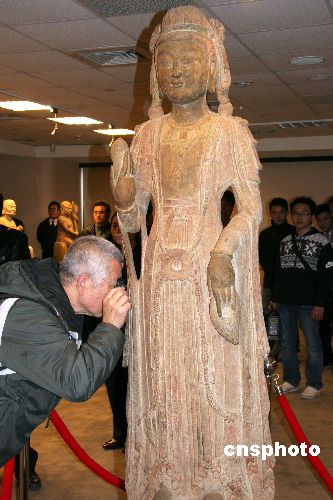 一月四日,一位觀眾在臺灣中華皇家藝術博物館近距離欣賞首次展出的該館鎮館之寶——國寶級文物“大勢至菩薩”石像。由該館推出的“中華瑰寶系列——宋朝漢白玉十八羅漢特展”當日在臺北開展,造型中西合壁、保存完好,被認為是全球唯一保存最完整的“大勢至菩薩”塑像也同期與觀眾首度見面。據考證,這尊高一百九十八厘米、石灰石貼金敷彩“大勢至菩薩”為東魏至北齊年間作品,距今約一千六百年至一千四百年。中新社發 孫自法 攝