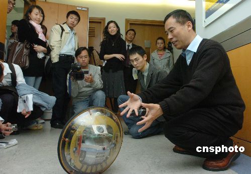 圖為徐揚生教授〔右一〕向傳媒介紹其新研發(fā)的單輪機械人。