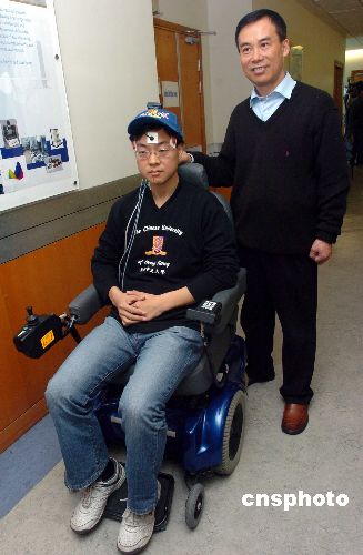 圖為徐揚生教授〔右一〕向傳媒介紹其新研發(fā)的以頭部或眼球動作操控的智能輪椅。