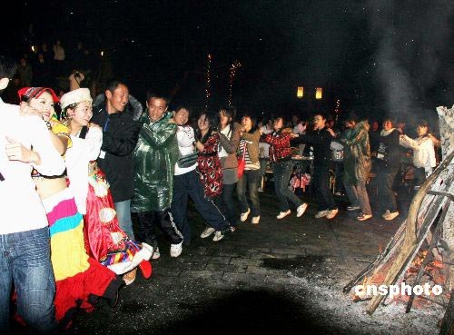 3月12日晚,正在重慶永川交流訪問的日本高中生訪華代表團與永川中學高中生攜手舉辦一場篝火晚會,中日兩國高中生圍繞著篝火一起踏歌起舞。中新社發 孫自法 攝