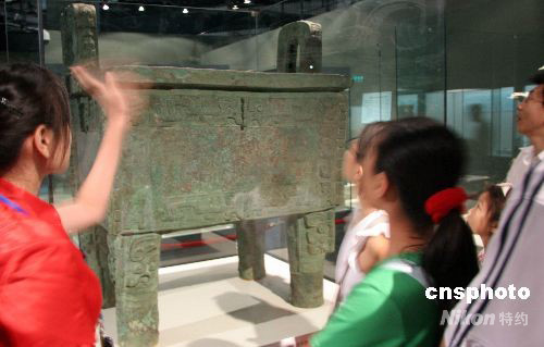 8月11日,“國寶”級(jí)文物——司母戊大方鼎在中國科技館新館的中國古代發(fā)明創(chuàng)造文物展上展出,成為備受觀眾矚目的焦點(diǎn)展品之一。中新社發(fā) 孫自法 攝