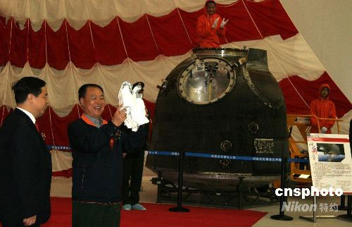 10月1日上午,神舟七號載人飛船返回艙在其誕生地——中國航天科技集團公司所屬中國空間技術研究院舉行開艙暨搭載物交接儀式,伴隨三位中國航天員太空飛行六十八小時二十七分鐘的一批特殊“乘客”一一精彩亮相,隨后各歸其主。圖為中國載人航天工程航天員系統(tǒng)總指揮兼總設計師、中國航天員科研訓練中心主任陳善廣展示將由該中心珍藏、首次成功使用過的“飛天”艙外航天服手套。中新社發(fā) 孫自法 攝