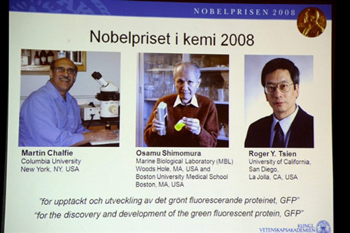當(dāng)?shù)貢r(shí)間10月8日11時(shí)45分左右(北京時(shí)間10月8日17時(shí)45分左右),瑞典皇家科學(xué)院諾貝爾獎(jiǎng)委員會(huì)于宣布,將2008年度諾貝爾化學(xué)獎(jiǎng)授予美國(guó)日裔科學(xué)家下村修(Osamu Shimomura)、美國(guó)科學(xué)家馬丁·查爾菲(Martin Chalfie),以及美國(guó)華裔科學(xué)家錢永健。他們?nèi)嗽诎l(fā)現(xiàn)和研究綠色熒光蛋白(GFP)方面有突出成就。