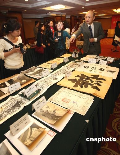 十月十六日,四百余件華僑華人捐贈的藏品首次在北京華僑飯店亮相。由中國華僑歷史博物館接受的這些藏品反映了上個世紀海外華僑生存和發展的歷史,見證了華僑華人與祖國共命運,共發展的史實。目前,中國華僑歷史博物館正在籌建中。中新社發 史利 攝