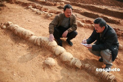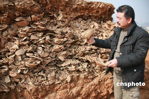 2008年12月20日,歙縣北宋龍窯遺址發掘現場。近日,安徽歙縣桂林鎮發現一處北宋龍窯遺址,面積達3700多平方米,出土了大量精美青瓷珍貴文物。經安徽省考古專家勘察鑒定為北宋時的龍窯,主要生產陶器和青瓷,專家分析至少有上千件珍稀文物。該處北宋龍窯遺址于2008年9月開挖績黃高速公路3標段連接線時發現。中新社發 方也廣德 攝