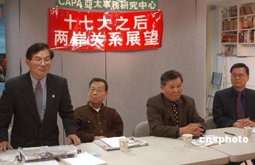 紐約僑學界當地時間十月十九日舉行座談會,展望中共十七大后的兩岸關系。與會代表認為,中共總書記胡錦濤在十七大上所作報告中有關臺灣問題的論述言簡意賅,既展示了相當的善意,又充滿自信。圖為紐約中國和平統一促進會會長花俊雄(右一)在座談會上發言。中新社發 劉小青 攝