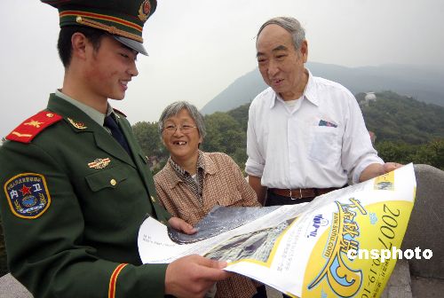 10月24日,擔負南京中科院紫金山天文臺守衛任務的武警江蘇總隊某部官兵在向游客講解月球相關天文知識、分發天文知識的宣傳資料。當天嫦娥一號即將發射。中新社發 唐占軍 攝