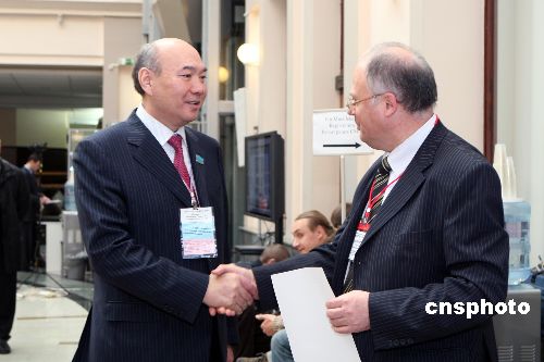 圖為哈薩克斯坦議會副議長、獨聯體國家議會組織觀察團協調人茹馬古洛夫(左),會見俄中央選舉委員會成員。
