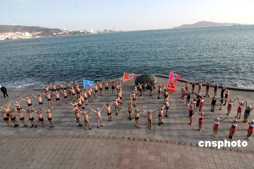 圖:山東威海百名冬泳隊員健身宣傳奧運