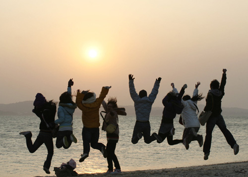 臺灣地區2007年最后一道夕陽,十二月三十一日出現在金門,古寧頭慈堤外,青年追日族興奮揮別落霞,準備迎接新一年到來。(“中央社”圖;倪國炎攝)