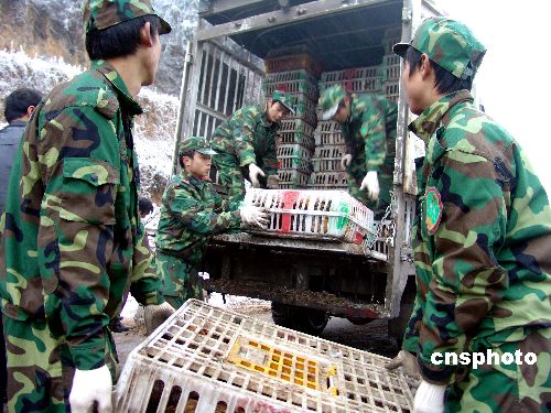 半個多月的凝凍天氣,使貴州清鎮(zhèn)麥格鄉(xiāng)小谷隴村村萬余只成熟肉雞難以運(yùn)出。1月31日,該市人民武裝部的應(yīng)急民兵緊急出動,幫助村民及時將肉雞運(yùn)往收購地點(diǎn)。中新社發(fā) 申時進(jìn) 攝