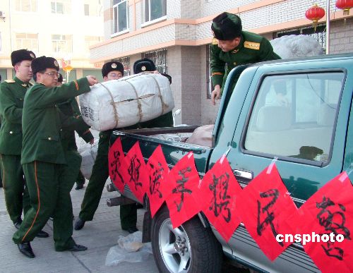 2月3日,黑龍江省武警部隊牡丹江市邊防支隊所屬東寧、穆棱、綏芬河三個邊防縣(市)部隊官兵,開展為災區人民捐款捐物等抗災救助活動。中新社發 莊文斌 攝