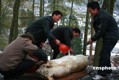 2月4日是農歷的“立春”節氣,被冰雪封凍20多天的廣西融水縣滾貝鄉災民殺豬喜迎新春。由于得到當地政府的及時救助,面對遭受57年來最嚴重的雨雪冰凍災害,災民們對未來依然充滿信心。中新社發 張耀華 攝