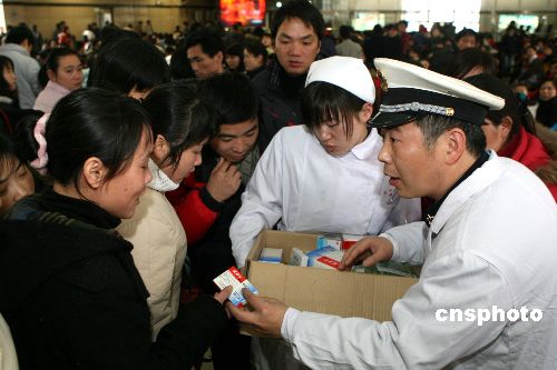 持續(xù)的大范圍災(zāi)害性雨雪天氣給回鄉(xiāng)過春節(jié)的旅客帶來不便。2月5日,中國(guó)海軍上海保障基地派出醫(yī)療隊(duì),冒著嚴(yán)寒來到上;疖囌久赓M(fèi)為旅客送醫(yī)送藥。中新社發(fā) 穆東祥 攝