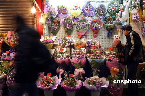 二月十三日,一位市民走過香港街頭的鮮花攤檔。情人節前夕,香港各鮮花店生意開始昌旺。中新社發 武仲林 攝