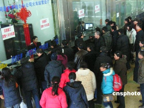 2月15日,人們在齊齊哈爾火車站售票大廳購票。當日,齊齊哈爾火車站在探親返城客流和農民工客流出現高峰后,又迎來學生客流高峰,日送來往旅客達2.5萬人。為緩解購票難,車站增加了應急售票窗口,車站派出所派出警力24小時巡查,并在廣場設置一臺報警服務車,隨時為旅客提供服務。 中新社發 王云龍 攝