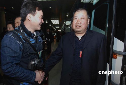 三月二日清晨六時余,有“皇帝作家”之稱的十一屆全國人大代表、歷史小說家凌解放(筆名“二月河”),隨河南代表團乘火車抵京,出席即將于五日開幕的第十一屆全國人大一次會議。圖為他在火車站接受中新社記者采訪。 中新社發 王東明 攝