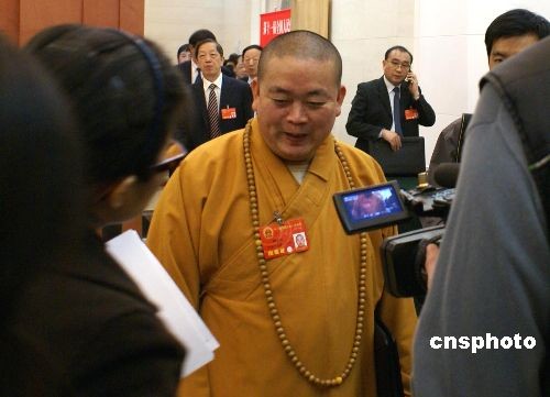 三月六日上午,河南代表團全體會議在北京人民大會堂召開,人大代表、嵩山少林寺方丈釋永信大師頻頻被媒體記者圍訪。圖為會議結束后,記者截住大師連連發問。中新社發 史寶銀 攝