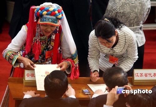 3月17日下午,十一屆全國人大一次會議在北京人民大會堂舉行第七次全體會議,決定國務院副總理、國務委員、各部部長、各委員會主任、中國人民銀行行長、審計署審計長及國務院秘書長人選;表決全國人大各委員會主任委員、副主任委員、委員名單草案。在投票表決間隙,一些全國人大代表抓緊時機在各代表團坐席請省領導簽名留念。 中新社發(fā) 張宇 攝