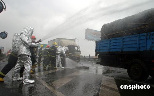 2008年4月9日,在濟(jì)青高速公路零公里處,山東省高速公路交警支隊(duì)聯(lián)合消防、醫(yī)療救護(hù)、環(huán)保等單位舉行了“迎奧運(yùn)、保暢通”模擬交通事故救援演練。演練模擬在濟(jì)青高速公路零公里處,一輛油罐車與一輛貨車發(fā)生碰撞,油罐車起火,隨時都有爆炸的可能。而后面的貨車因猛烈撞擊,造成駕駛室嚴(yán)重變形,駕乘人員被困車內(nèi)。山東省高速公路交警支隊(duì)接到報(bào)警后,迅速趕到現(xiàn)場進(jìn)行處理,同時啟動重特大交通事故處置聯(lián)動機(jī)制,及時通知消防、醫(yī)療救護(hù)、環(huán)保等部門聯(lián)動,并在30分鐘內(nèi)將火勢控控制,救治被困受傷人員,恢復(fù)車輛正常通行。作者: 龔輝