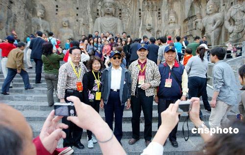 4月9日,來自臺灣和大陸的近百名退役將軍在河南洛陽參觀了龍門石窟等歷史文化景點。中新社發 曾憲平 攝