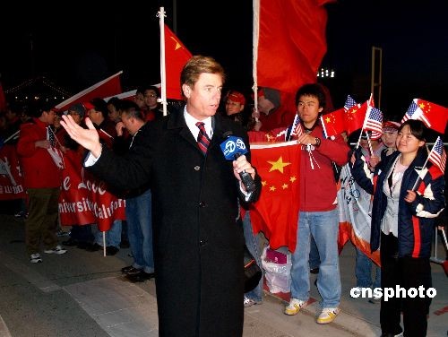 當地時間4月9日晨,成千上萬的華人華僑和中國留學生聚集在美國舊金山,目睹北京奧運圣火傳遞,美國廣播公司7號電視臺記者在歡迎人群現場作實況轉播。作者: 盧威