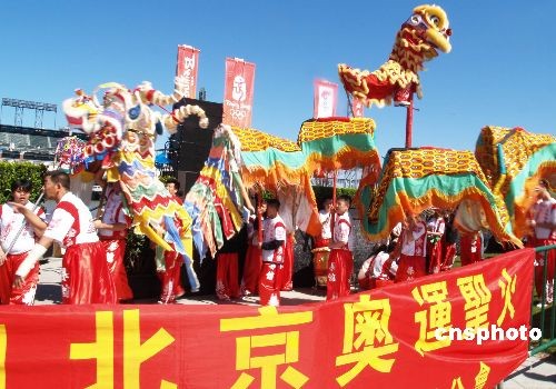 當地時間4月9日,北京奧運圣火傳遞舊金山,在美國的華人華僑舞獅舞龍熱烈慶祝,舞獅還“跳”上4米多高的木柱子,作空中表演。作者: 盧威