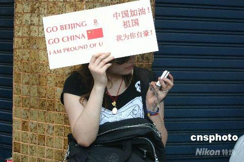 圖為一名華人女孩在圣火傳遞沿途舉牌助威。 沈晨 攝
