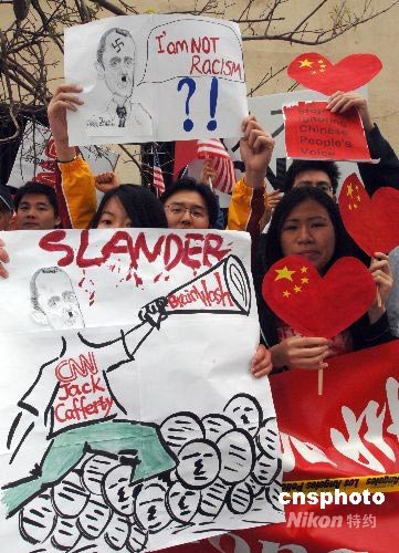 當(dāng)?shù)貢r(shí)間4月19日,洛杉磯爆發(fā)十幾年來最大規(guī)模的華人華僑抗議示威活動(dòng)。數(shù)千名華人華僑和留學(xué)生在CNN洛杉磯分部門前參加和平示威,要求CNN向公開鄭重道歉,并開除卡弗蒂。圖為抗議者打出漫畫諷刺卡弗蒂利用手中話筒進(jìn)行“洗腦”。中新社發(fā) 張煒 攝