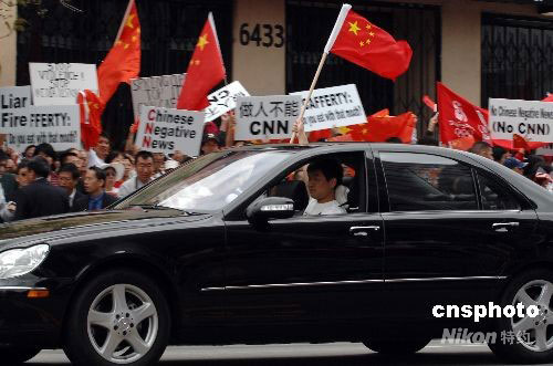當(dāng)?shù)貢r(shí)間4月19日上午,一名抗議者一手揮舞五星紅旗、一手緊握方向盤(pán)駕車(chē)經(jīng)過(guò)示威現(xiàn)場(chǎng)。洛杉磯當(dāng)天爆發(fā)十幾年來(lái)最大規(guī)模的華人華僑抗議示威活動(dòng)。數(shù)千名華人華僑和留學(xué)生在CNN洛杉磯分部門(mén)前參加和平示威,要求CNN向公開(kāi)鄭重道歉,并開(kāi)除卡弗蒂。中新社發(fā) 張煒 攝